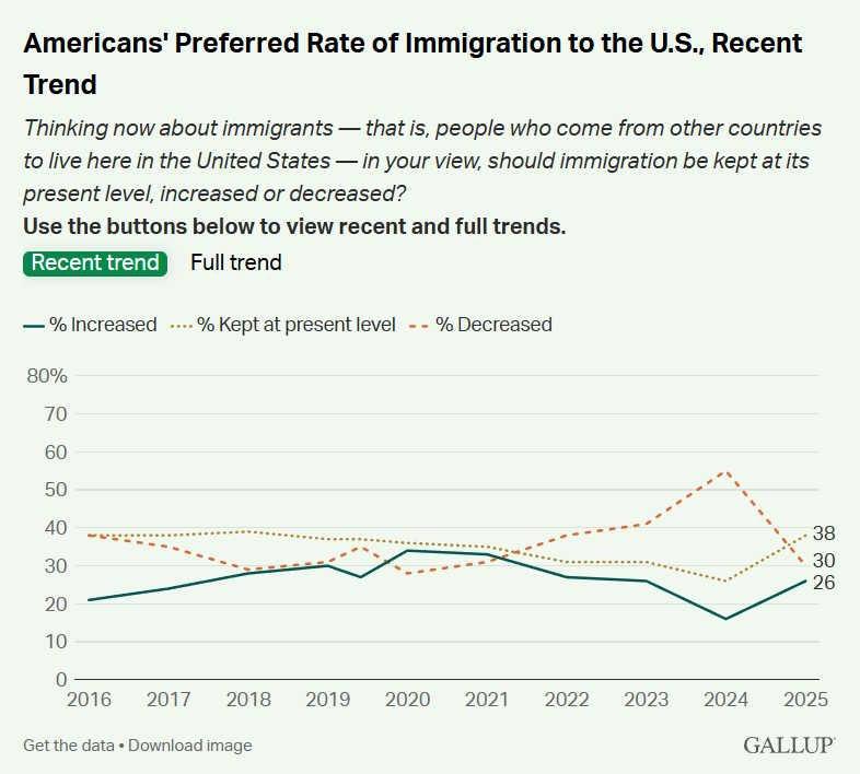 But MAGA has a big problem: While that worldview has some appeal to Americans, overall they aren't on board. Every poll we have shows pro-immigration sentiment on the rise again, after a dip during the Biden years: