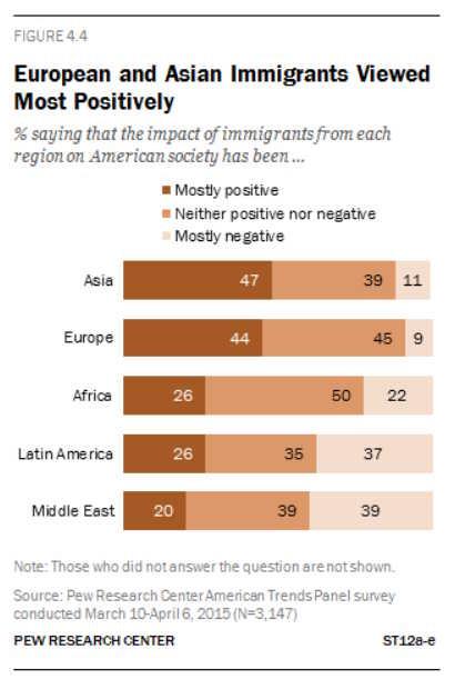 And although there are differences in American attitudes toward immigrants from different regions of the world, the differences aren't huge, and they don't perfectly line up with how developed the regions are. For example, here's a 2015 poll by Pew, finding that immigration from Africa is viewed more favorably than immigration from the much more developed regions of Latin America and the Middle East:
