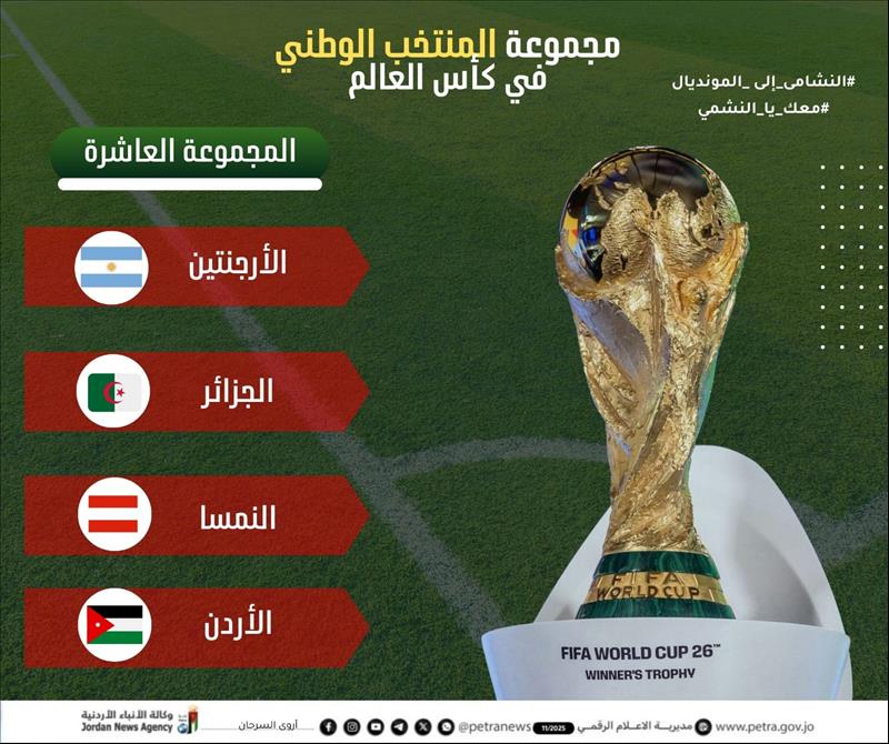 Amman, Dec. 5 (Petra)-- The draw for the World Cup qualification rounds, held on Friday, placed Jordan's national football team in Group 10 alongside Argentina, Austria, and Algeria one of the most competitive groups featuring diverse footballing styles.