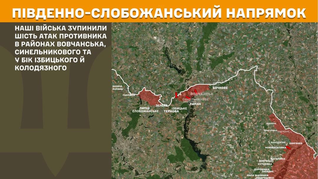 In the Southern Slobozhanshchyna sector, the Defence Forces stopped six enemy assaults near Vovchansk, Synelnykove, and toward Izbytske and Kolodiazne.
