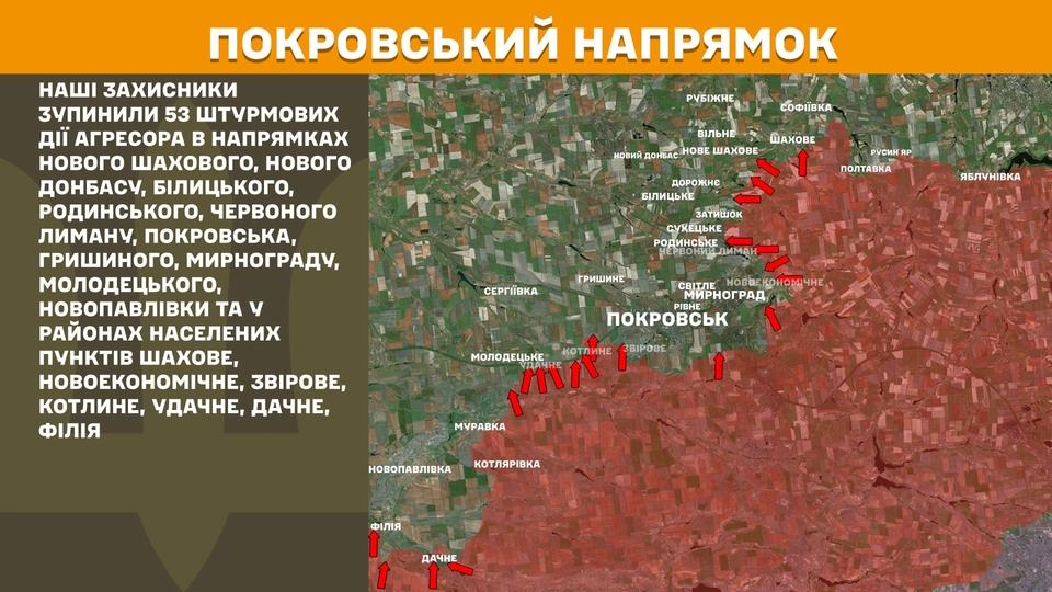 In the Pokrovsk sector, Ukrainian defenders stopped 53 enemy assaults near Nove Shakhove, Novyi Donbas, Bilytske, Rodynske, Chervonyi Lyman, Pokrovsk, Hryshyne, Myrnohrad, Molodetske, Novopavlivka, as well as Shakhove, Novoekonomichne, Zvirove, Kotlyne, Udachne, Dachne, and Filiia.
