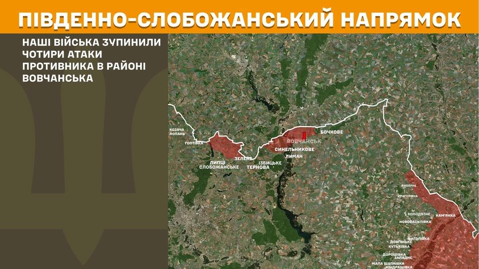 In the Southern Slobozhanshchyna sector, Ukrainian forces repelled four enemy attacks near Vovchansk.