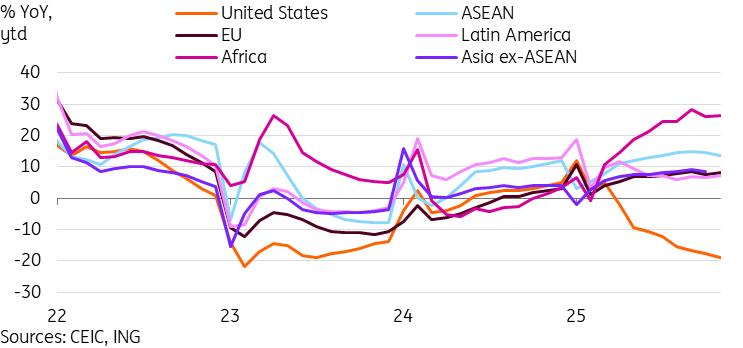 By destination, exports to the US continued to slow in November, despite the trade truce. November exports to the US were down -28.6% YoY, a three-month low, bringing the year-to-date growth to -18.9% YoY. It's likely that November exports have yet to fully reflect the tariff cut, which should feed through in the coming months. Also, the frontloading effect as US importers ramped up purchases ahead of tariffs will act as a headwind on trade in the coming months. Instead of the US, the beat in November's data came from an acceleration of exports to the EU. They were up 14.8% YoY in November to bring the ytd growth to 8.1% ytd. We also saw a rebound of exports to Japan, which rose 4.3% YoY in November for a ytd growth of 3.4%. Exports to ASEAN, which have in recent years been China's most important destination, fell to 8.2% YoY in November.