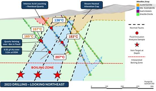 Results indicate that 2023 drilling terminated above the modelled "boiling zone", which typically begins at fluid temperatures of >220°C. Alteration study confirms Si2 is a classically zoned low-sulphidation epithermal system exhibiting evidence for higher temperature fluid in the vicinity of the 2023 drilling.