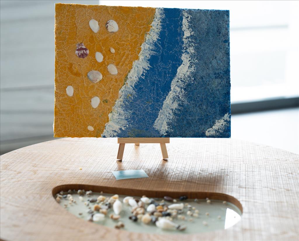 The pieces include paintings, drawings in different styles and colors, models, and handicrafts expressing the participants' vision of the sea.