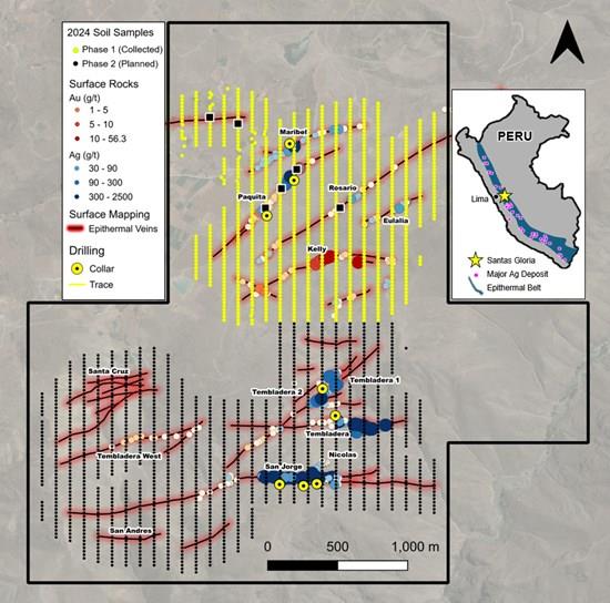 - 1,037 soils collected, covering over 6.5 kilometers ("km") of cumulative vein strike length Phase 1 focused on the northern veins, including Maribel, Paquita, Rosario, Eulalia, Kelly and several unnamed vein sets (Figure 1) Samples have been submitted to ALS, Lima for full multielement ICP analysis, with results anticipated in 4 to 5 weeks;