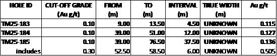 Intervals for TM25-190 in Table 3.0 are reported as core length not True Width. True Width cannot be estimated at this time due to insufficient data.