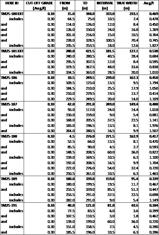 | HOLE ID | CUT-OFF GRADE (Au g/t) | FROM (m) | TO (m) | INTERVAL (m) | TRUE WIDTH (m) | Au g/t |