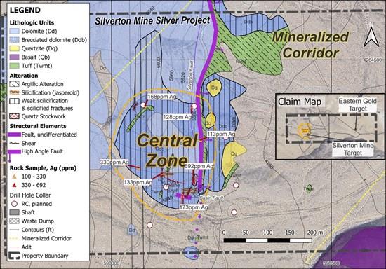 - In the western portion of the property, in the Central Zone, in proximity of the intersection of the N-S Silverton and the E-W Basin Faults, silicification comprises veins, zones of stockwork and occurrences of jasperoid with significant silver mineralization – the primary drill target. In the eastern portion of the property an area of quartz veinlets and extensive jasperoid alteration with gold mineralization forms a secondary exploration target.