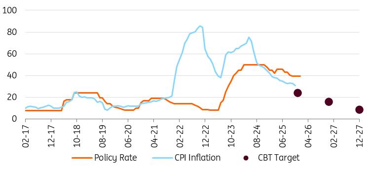 In the short term, we believe the market has gone too dovish and the CBT meeting this week is a hawkish risk to current market pricing unless the central bank cuts by more than 150bp (100bp is our baseline). In the medium term, however, we believe the market should price in more rate cuts, more in line with our forecast once we see further weaker inflation prints.