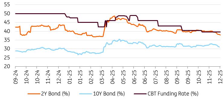 Survey of market participants released by the CBT shows further deterioration in inflation expectations in November. The 12-month-ahead inflation expectations increased to 23.5%, while the 24-month-ahead CPI expectations rose to 17.7%. In the survey, year-end inflation expectations for 2025 and 2026 stood at 32.2% and 23.2%, respectively, recording a deterioration in comparison to a month ago. While we will likely see an improvement in December with the favourable November inflation surprise, the survey implies that the market sees the disinflation process likely to proceed more slowly than implied by the CBT's interim targets.