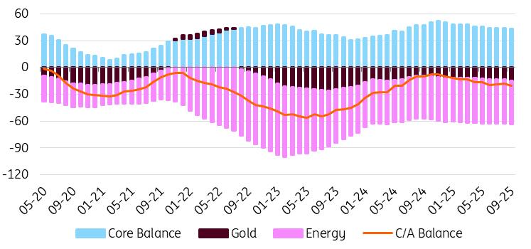 The September current account posted a surplus of US$1.1bn, broadly in line with the market forecast. A closer look at the monthly figures shows that the surplus narrowed compared to the same month last year, primarily due to a higher trade gap, which deteriorated from $-3.1bn to $-5.4 bn. This deterioration was mostly driven by a lower core trade surplus and a worsening balance in net gold trade.