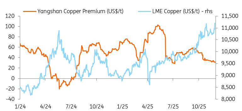 The Yangshan premium has recently slumped to its lowest since July. The premium is paid on top of global exchange prices and is usually a good measure of Chinese buying appetite. Its peak was just above $150/t. This could put a ceiling on copper's upside.