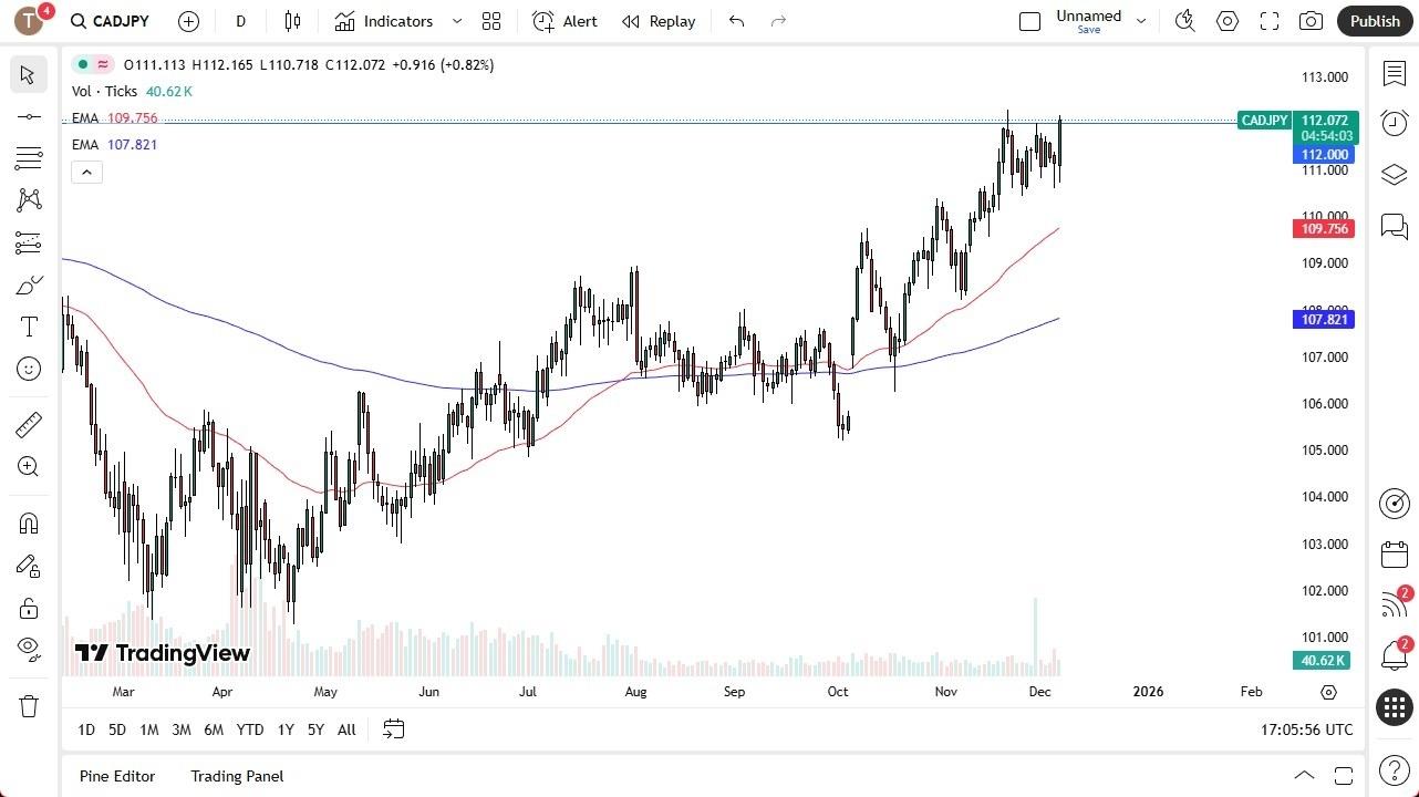 - The Canadian dollar surged on Friday after far stronger-than-expected employment data, lifting CAD/JPY as yen weakness persists. Key support sits near 111 and 110.50, with momentum favoring upside targets toward 113 and potentially 114 amid continued yen vulnerability.