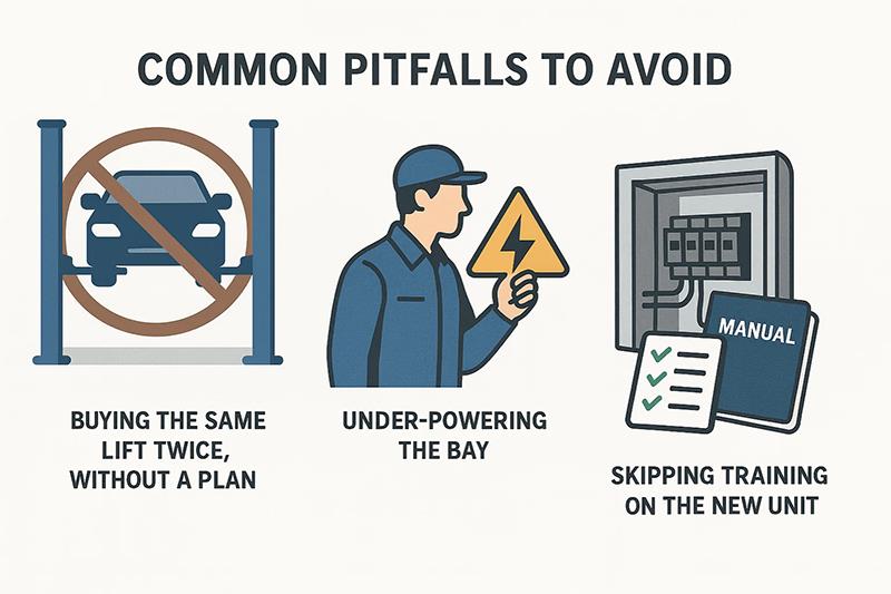 Power Supply: Most two-post lifts need a dedicated 208-240V circuit. Never use an extension cord. Heavier models may require 3-phase power. Have a qualified electrician confirm your panel's capacity.