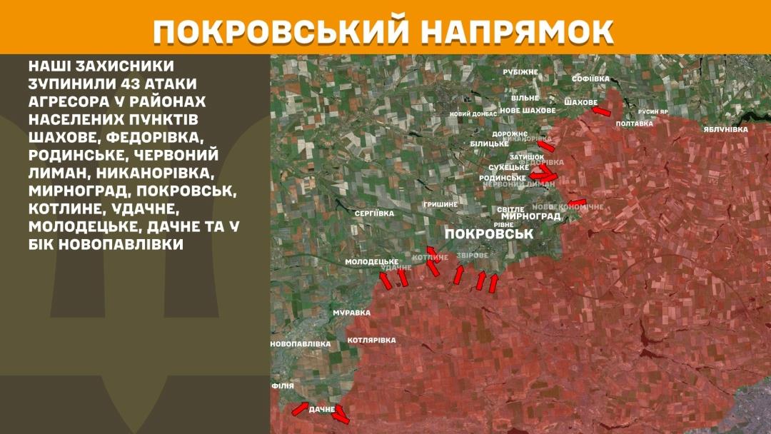 In the Pokrovsk direction, Ukrainian defenders stopped 43 Russian attacks in the areas of Shakhove, Fedorivka, Rodynske, Chervonyi Lyman, Nikanorivka, Myrnohrad, Pokrovsk, Kotlyne, Udachne, Molodetsk, Dachne, and in the direction of Novopavlivka.