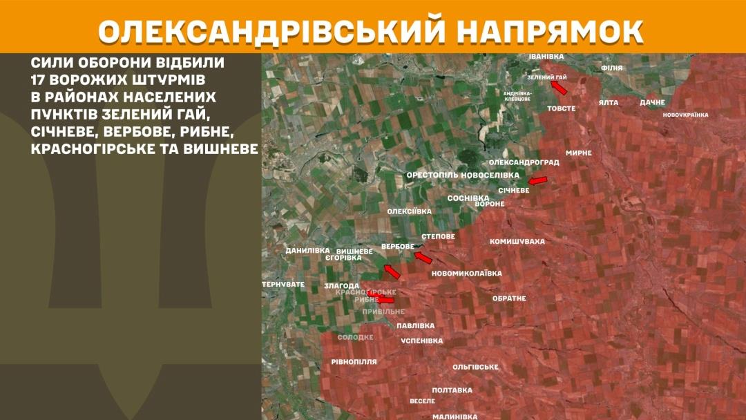 In the Oleksandrivka direction, the Defense Forces repelled 17 enemy assaults in the areas of Zelenyi Hai, Sichneve, Verbove, Rybne, Krasnohirsk, and Vyshneve.