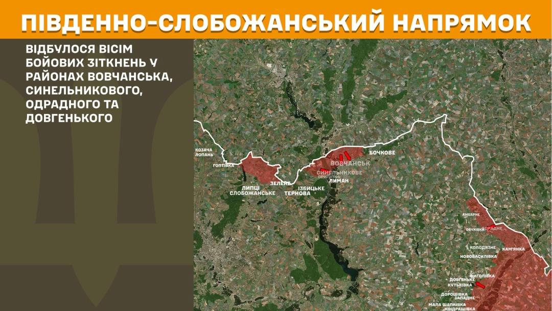 In the South Slobozhansky direction, there were eight combat engagements in the areas of Vovchansk, Synelnykove, Odradne, and Dovhenke.