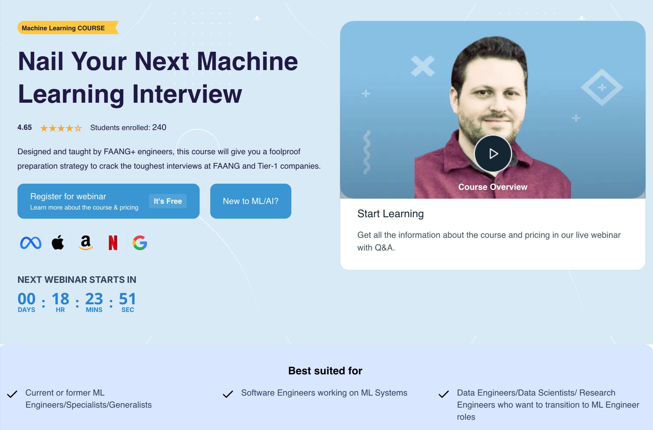 As previously announced, the Machine Learning Interview Masterclass requires students to commit 10 to 12 hours each week as they progress through a structured curriculum. Over four months, participants study data structures and algorithms, system design, and core machine learning concepts, including supervised learning, unsupervised learning, deep learning, and reinforcement learning. Instructors include FAANG+ hiring managers, ML engineering leads, and senior technical professionals who bring real-world perspectives from large-scale machine learning systems.