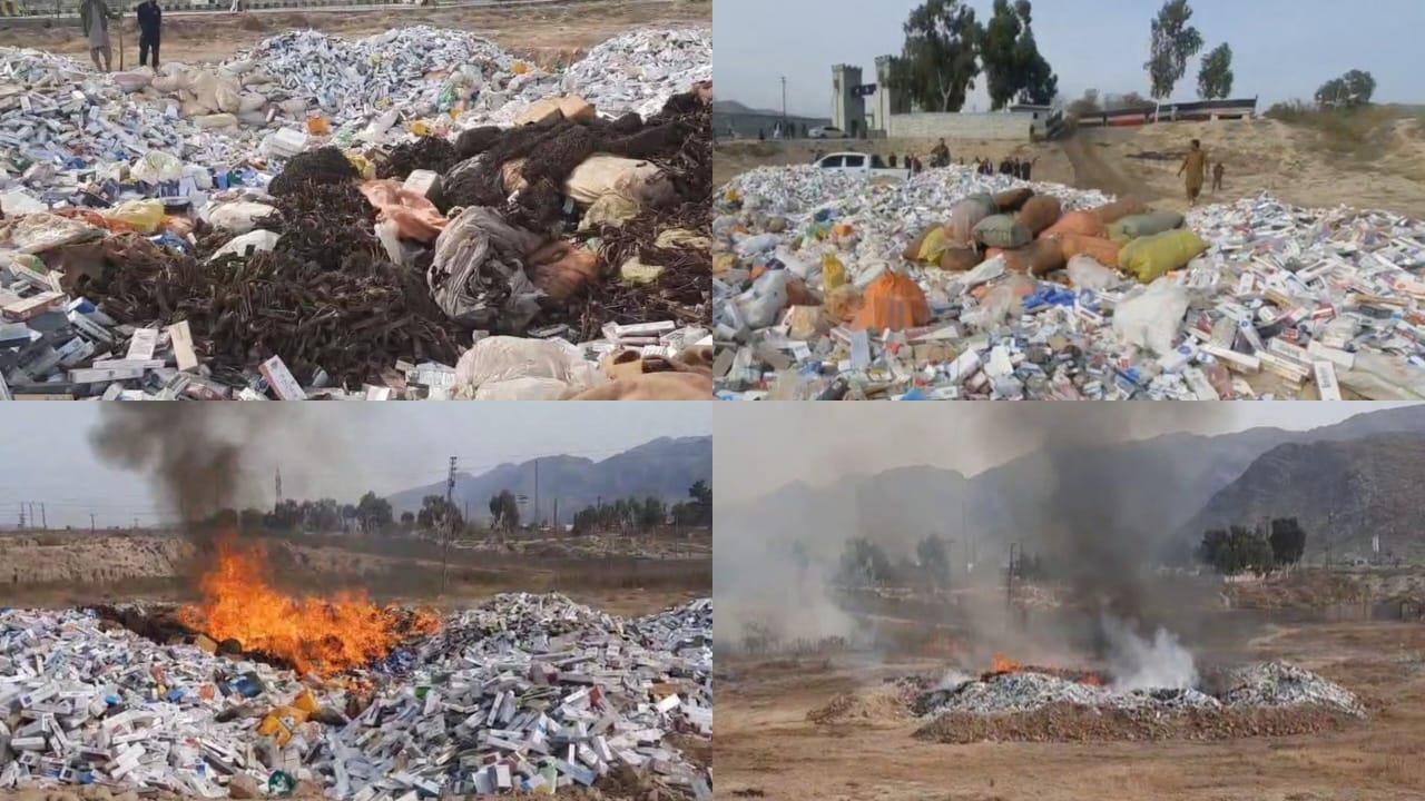 At the Torkham border, the Frontier Corps (North) destroyed confiscated illegal and foreign-smuggled goods in 2025 by setting them on fire at the FC camp in Landi Kotal.
