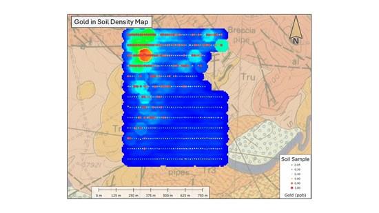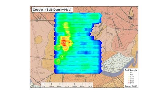 Overlapping clusters of elevated gold-in-soil values coincide with the copper trend and are characteristic of leakage halos above mineralized porphyry centers. This dual response-copper and gold provides increased understanding in the geometry of the subsurface system.