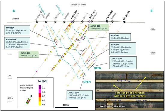 Figure 3. Section (B to B') looking north showing results from holes AW-25-007 and 008 drilled up-dip from FAVD64 and AW-24-005 at the Koivu Zone. See references below for sources of historical data. Inset, box photos of AW-24-007 showing drill core from 96 to 99.5 meters downhole. Zones of bleaching was caused by silica-sericite-carbonate alteration associated with veins and veinlets of quartz-carbonate-pyrite and disseminated gold mineralization. Abbreviations, qtz = quartz, ser = sericite, ab = albite, carb = carbonate, py = pyrite. *See references 7 and 10 for sources of data for holes FAVD01, 02, 03, 03, 04, 06, 07, FAVD26, and FAVD64. See February 27th, 2025 news release for results for holes AW-24-004 and AW-24-005