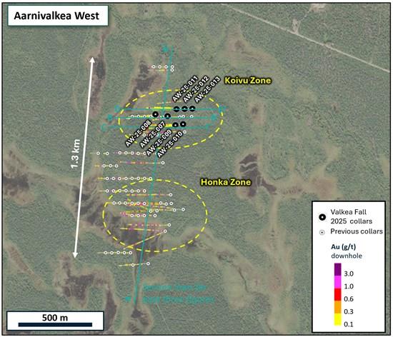 Fall 2025 Paana Project drill program complete: Seven drill holes at the Koivu Zone (Aarnivalkea West target) tested the up-dip and strike-extent of disseminated gold mineralization discovered in historical hole FAVD-64 (55.48 meters of 1.63 g/t gold including 8.50 meters of 8.57 g/t gold from 158.0 meters downhole7) and confirmed in hole AW-24-005 (36.45 meters of 1.50 g/t gold including 15.35 meters of 3.43 g/t gold from 150.15 meters down hole, see the Company's February 27th, 2025 news release ).