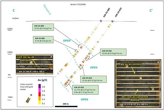 Drill holes AW-25-009 and AW-25-010 extend the strike-extent of Domain A, 50 meters south. Both holes intersected broad zones (up to 100 meters) of disseminated pyrite with intervals of strong carbonate-sericite-albite alteration with local bulk-tonnage style gold mineralization (e.g., 10.4 meters of 0.54 g/t gold from 193.95 meters downhole in AW-25-010 and 10.3 meters of 0.56 g/t gold from 138.8 meters downhole in AW-25-009, Table 1). A new zone of mineralization was also intersected near the bottom of AW-25-010 consisting of quartz-pyrrhotite veins and vein stockworks and quartz-carbonate-pyrrhotite-pyrite-chalcopyrite cemented breccias. This new zone of gold mineralization returned 6.0 meters of 1.15 g/t gold within 12.65 meters of 0.77 g/t gold from 331.8 meters downhole (Table 1 and Figure 4). Further drilling is warranted to test the extent of this zone of mineralization. All three holes drilled to the north intersected broad zones of Koivu-style alteration with local bulk-tonnage gold mineralization (e.g., 15.2 meters of 0.34 g/t gold at 190.75 meters downhole in AW-25-012, Figure 5) within Domain A. Higher-grade mineralized veins, outside of Domain A, were also intersected in AW-25-012 ( 17.55 g/t gold over 0.5 meters at 282.85 meters downhole, Table 1 and Figure 5) which demonstrates the added high-grade vein potential of the target area.