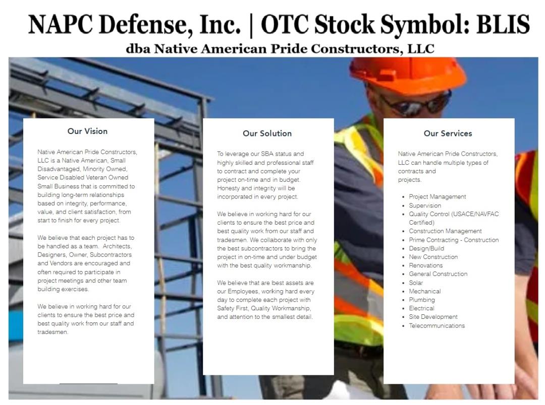 NAPC Defense, Inc. (OTC: BLIS ) is a military products sales and production company, fully licensed in the United States, with exclusive rights to produce and sell Corner Shot USA Systems, in addition to brokering other defense products throughout the world all with US State Department approval. Additional smaller military platforms and related products are in development.