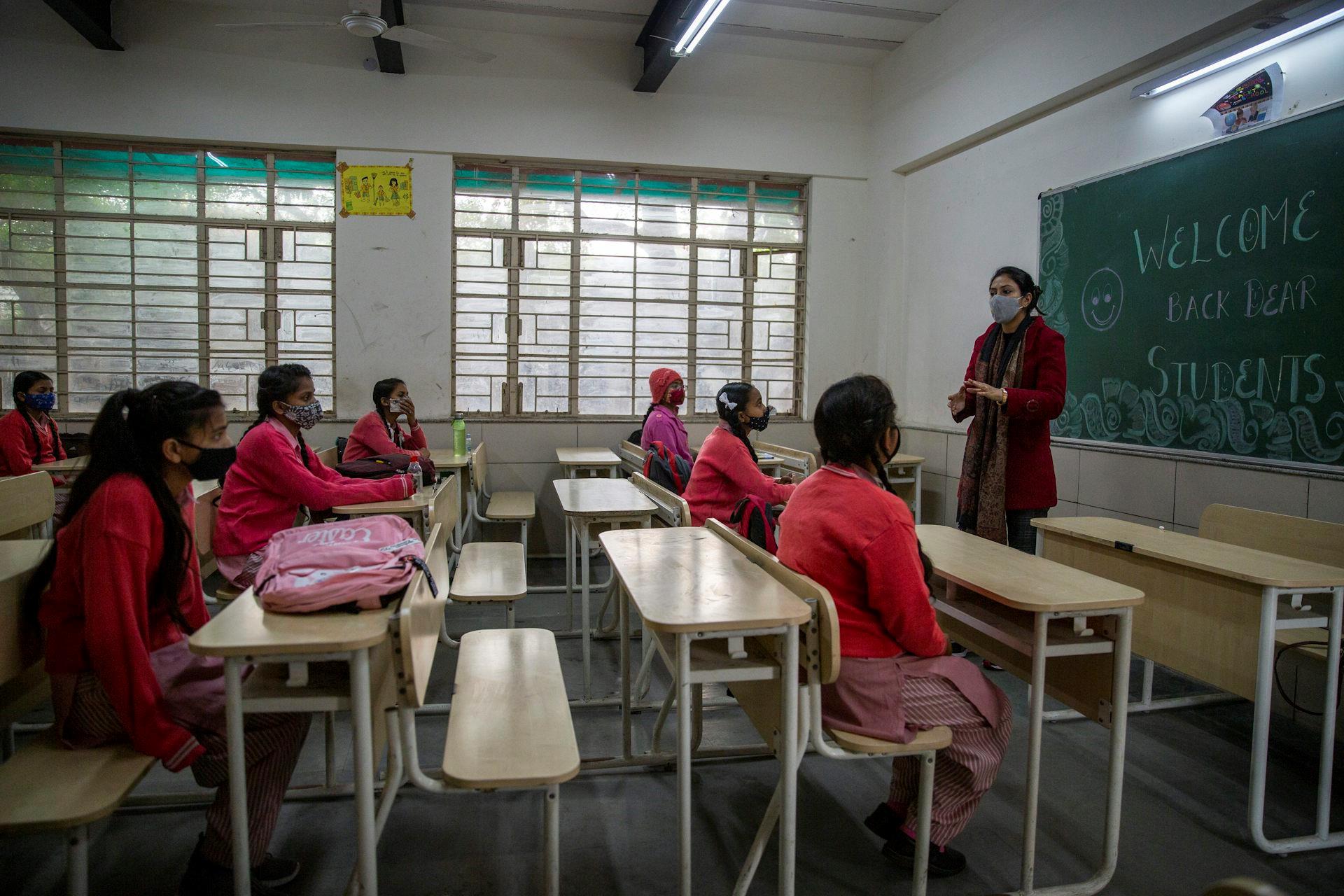 Students return to school after closures due to the COVID-19 pandemic in New Delhi, India, in 2021. (AP Photo/Altaf Qadri)