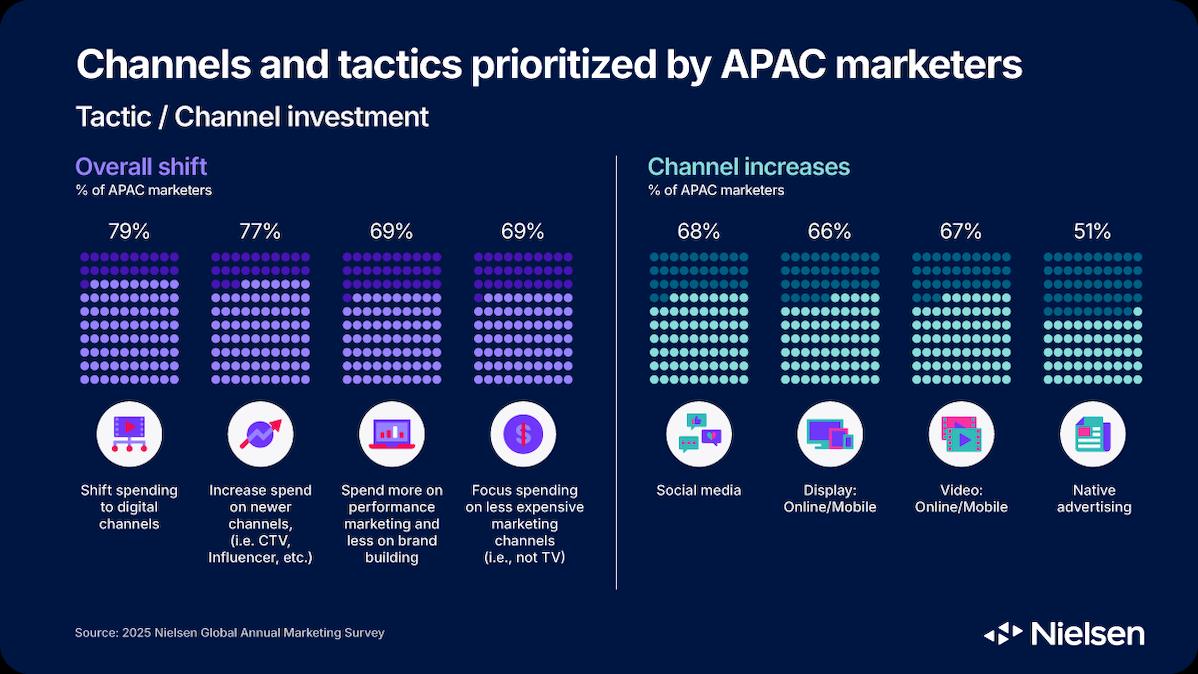A consistent emphasis on brand awareness naturally steers media strategies toward methods that maximize reach and consistent exposure. To meet that need for broad reach, APAC marketers are driving a significant shift, with 79% saying they're moving spending to digital channels. The move leverages widespread internet and mobile usage across the region, allowing for consistent presence and vast audience engagement. Digital thus proves itself as the go-to platform for achieving wide visibility, which is essential for brand recall.