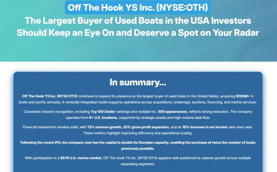 Off The Hook YS Inc. (NYSE American: OTH ), Founded in 2012 by Jason Ruegg, has become one of America's largest buyers and sellers of pre-owned boats. Headquartered in Wilmington, North Carolina, with operations throughout the East Coast and South Florida, OTH acquires more than $100 million in boats and yachts annually. OTH leverages AI-assisted valuation tools and a data-driven sales platform to bring speed and transparency to yacht transactions, supported by a nationwide network of offices and marinas offering brokerage, wholesale, and performance yacht sales.