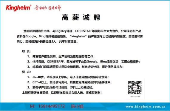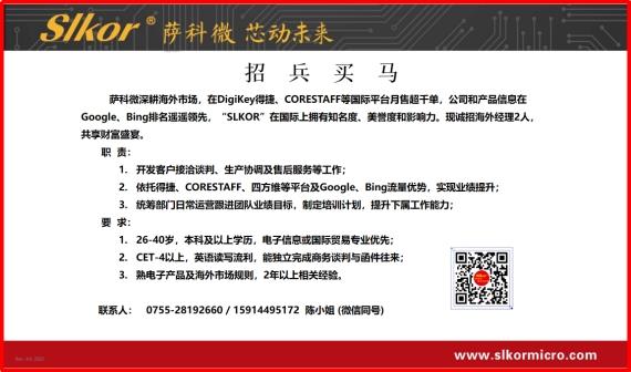 With the steady growth and increasing influence of Slkor Semiconductor and Kinghelm Electronics in the domestic market, the company has entered a new stage of rapid development. To accelerate global business layout and promote brand internationalization, we are now sincerely recruiting two Overseas Sales Managers to join us in exploring a broader world stage. Furthermore, Slkor Semiconductor's product portfolio is very rich, including not only analog-to-digital converters (ADCs) and V/F & F/V converter chips, but also high-end products like silicon carbide (SiC) diodes, SiC MOSFETs, IGBTs, fifth-generation ultra-fast recovery power diodes, etc., meeting the needs of industries such as new energy vehicles, high-end equipment, communication and power, solar photovoltaics, medical devices, and industrial internet. Slkor's general-purpose products include Schottky diodes, ESD protection diodes, TVS diodes, and other general-purpose diodes and transistors; power devices include high/medium/low voltage MOSFETs, thyristors, bridge rectifiers, etc.; and power management IC series like LDO, AC-DC, DC-DC chips, as well as sensors, high-speed optocouplers, crystals/oscillators, providing supporting services for customers, widely used in smartphones, laptops, robots, smart homes, IoT, LED lighting, 3C digital products, smart wearables, and the Internet of Everything! Slkor's sister company-Kinghelm-sells products worldwide, serving over ten thousand customers. Its products include Beidou/GPS dual-mode antennas, Bluetooth, WiFi, Zigbee, NB-IoT, LoRa, UWB antenna series, and supporting RF jumper cables; now product lines have expanded to include various board-to-wire connectors, board-end sockets/terminals, signal switch series, and three major series: automotive/motorcycle wiring harnesses, industrial/medical/research special cables, and custom-made non-standard products, working together with Slkor to provide complete solutions for electronic product companies.