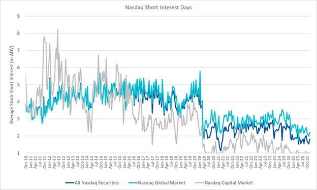 Short interest in 1,698 securities on The Nasdaq Capital MarketSM totaled 3,311,934,829 shares at the end of the settlement date of November 28, 2025, compared with 3,326,683,612 shares in 1,697 securities for the previous reporting period. This represents a 1.00 day average daily volume; the previous reporting period's figure was 1.00.