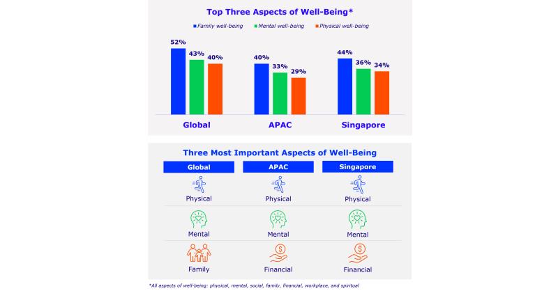 On a regional level, overall well-being in Asia Pacific lags behind the global average, with less than three in 10 (28%) Asia-Pacific respondents rating their overall well-being as "excellent" or "very good", compared to four in 10 (41%) globally. While physical and mental well-being are the two most important aspects of well-being for respondents globally, financial well-being is more important for those in Asia Pacific, coming in as the third most important aspect. With financial well-being remaining the weakest aspect across the globe, there is a pressing need for governments and organizations to render support to address financial concerns.