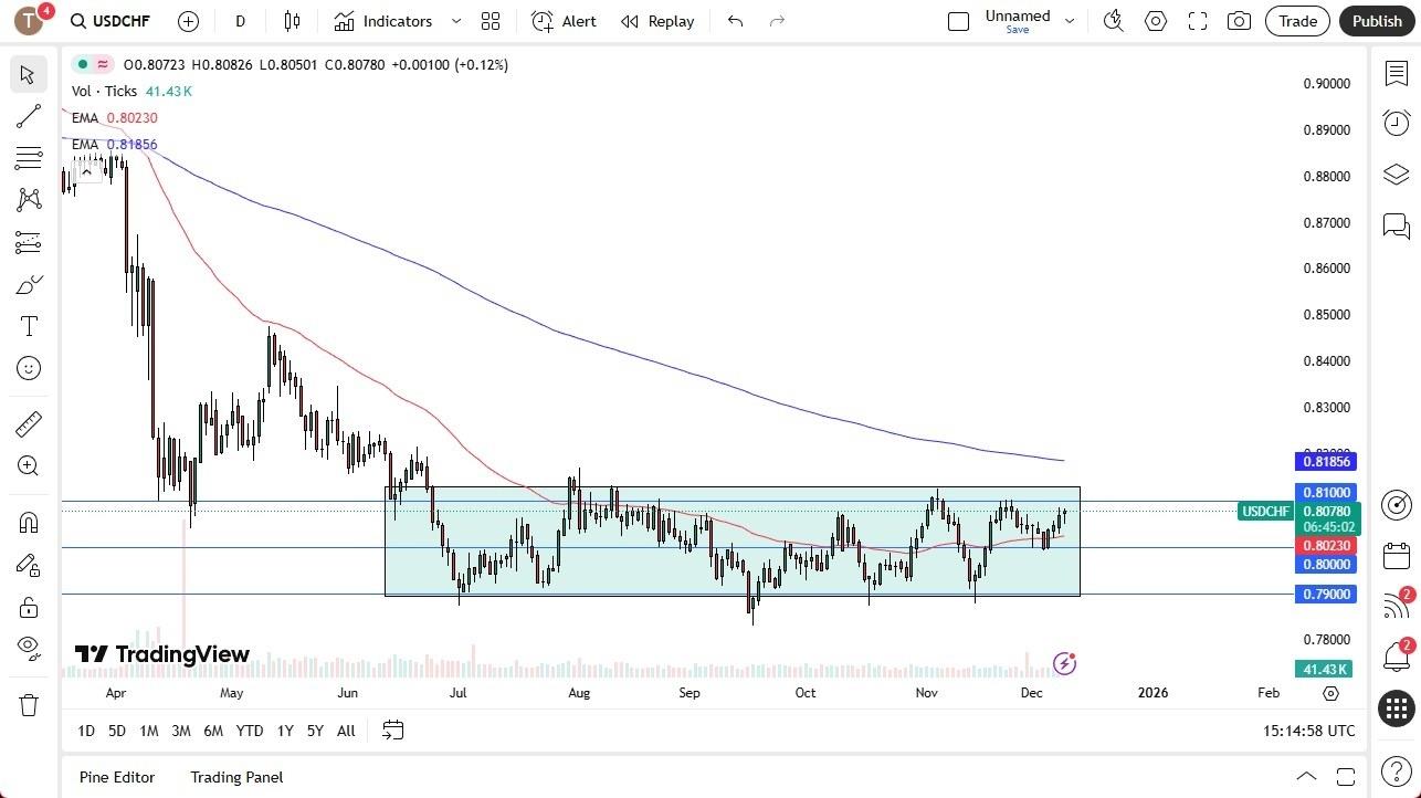 - USD/CHF reversed early weakness and is pressing resistance near 0.81, with traders watching 0.8150 and the 200-day EMA for a breakout. FOMC messaging and Swiss National Bank intervention remain central to the pair's long-term direction.