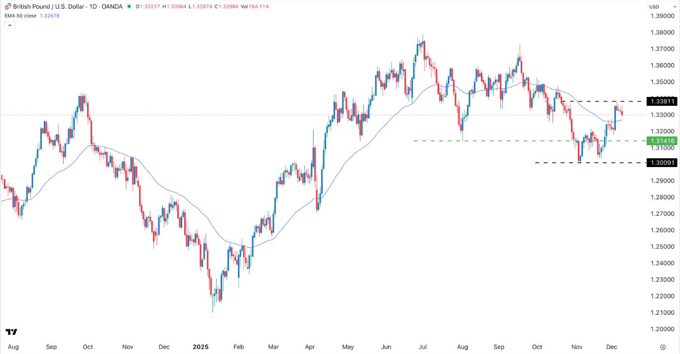 EURUSD Chart by TradingViewGBP/USD Technical AnalysisThe daily timeframe chart shows that the GBP/USD exchange rate has rebounded in the past few days, moving from the November low of 1.3000 to a high of 1.3380. It then pulled back slightly to the important support level at 1.3300.The pair has remained above the crucial support level at 1.3140, its lowest level on August 1. It has also remained above the 50-day moving average.It has also formed a small bullish flag pattern, a common continuation sign. Therefore, the most likely GBP/USD forecast is bullish, with the initial target being at 1.3380. A move above that level will point to more gains, potentially to the psychological level at 1.3500.On the other side, a drop below the key support at 1.3200 will cancel the bullish outlook and point to more downside, potentially to the key support at 1.3140.Ready to trade our free daily Forex trading signals? We've shortlisted the best UK forex brokers in the industry for you.
