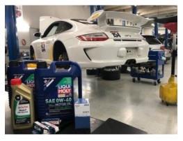 "A white Porsche GT3 is lifted on a service rack, surrounded by car maintenance supplies including motor oil and filters."EZ Lube Oil Change has earned a 4.9-star customer rating across four Antelope Valley locations through transparent pricing, no-pressure service, and drive-thru convenience, setting new standards for honest automotive maintenance.