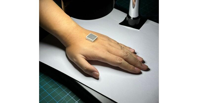 Prototype of WITEC's customised patch ultrasonic transducers that adhere to the human body using bioadhesive gel soft materials