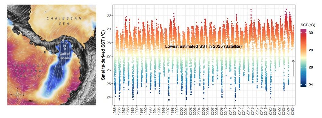 Each year between January and April, strong trade winds blowing across the isthmus of Panama create ideal conditions for upwelling in the Gulf of Panama. As surface waters are pushed offshore, cooler, nutrient-dense water from deeper layers rises to replace it. This process fuels phytoplankton growth, bolsters coastal fisheries, and cools coral reef ecosystems, helping them survive seasonal thermal stress.