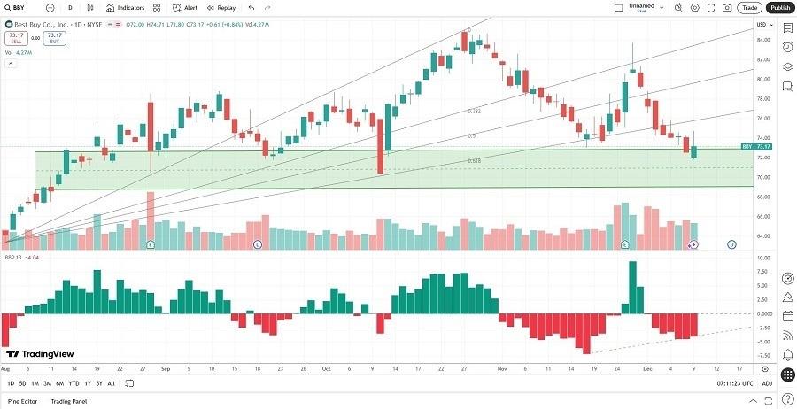 (MENAFN- Daily Forex) Long Trade IdeaEnter your long position between $68.72 (the lower band of its horizontal support zone) and $72.75 (the upper band of its horizontal support zone).Market Index Analysis Best Buy (BBY) is a member of the S&P 500. This index trades inside a bearish chart formation with rising breakdown catalysts. The Bull Bear Power Indicator of the S&P 500 is bullish with a descending trendline.