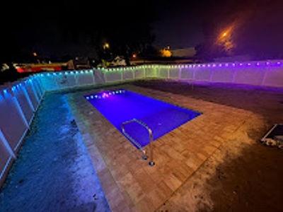 "The photograph shows a freshly constructed inground pool surrounded by light-colored travertine or paver decking. The water is glowing a deep blue from the interior lighting. A safety fence surrounds the area, and what makes the scene unique is the multi-colored LED strip lighting along the fence line, which transitions from green to blue to purple, creating a vibrant, resort-like atmosphere. A metal handrail provides access into the pool."Florida homeowners increasingly select fiberglass pools over traditional materials, prioritizing faster installation timelines and reduced maintenance. Hawaiian Island Pools documents this market shift through client consultations and completed projects.