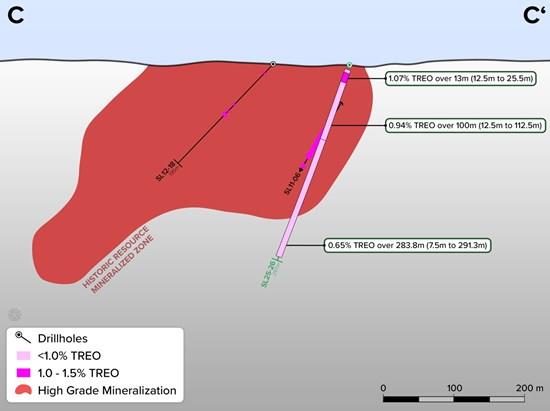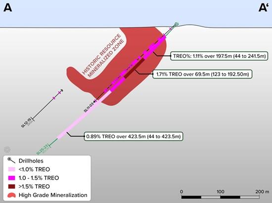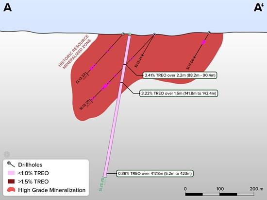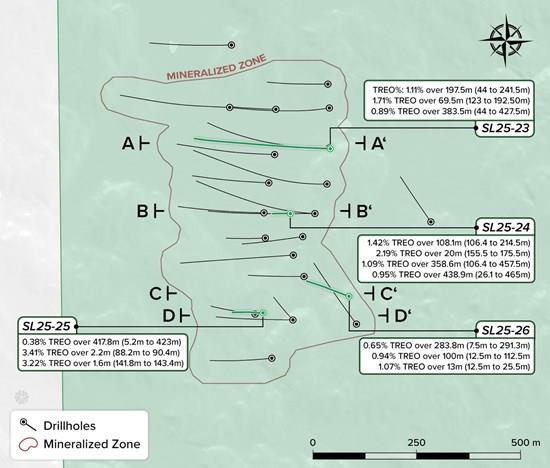Borehole SL25-24 was drilled sub-vertical (at -85°), to test the mineralization at depth below the historical resource estimate. The borehole returned significant mineralization, 0.95% TREO, over the entire sampled interval, to end-of-hole at 465m.