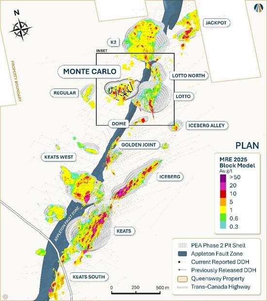 In July 2025, the Company completed a PEA at Queensway (see New Found Gold news release dated July 21, 2025 ). Recent drilling continues to yield new discoveries along strike and down dip of known gold zones, pointing to the district-scale potential that covers a +110 km strike extent along two prospective fault zones at Queensway.
