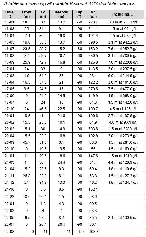 Throughout these six drilling campaigns performed at the Kate, fifty-four drill holes were drilled by Viscount. Of these, twenty-five drill holes presented intervals assaying greater than 110 g/t and ten drill holes displaying intervals assaying over 400 g/t.