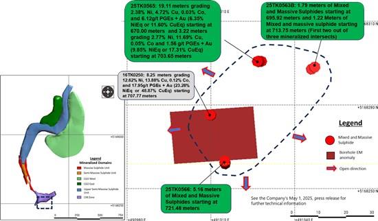 As outlined in the Company's November 4, 2025 press release, Talon reported that BHEM surveys from drill hole 25TK0565 and from the deepening of historic drill hole 16TK0250 indicated potential lateral continuity of massive sulphides within the upper parts of the stratigraphy, located approximately 88 meters above drill holes 25TK0563 and 25TK0563B. These high conductivity plates suggested that the massive sulphide interval intercept of 8.25 meters (from 707.77 to 716.02 meters) grading 12.62% Ni, 13.88% Cu, 0.12% Co and 17.95 g/t PGEs+Au (see the Company's May 1, 2025 press release ) in drill hole 16TK0250 could extend laterally to the south.