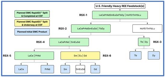 The CDF work has focused on the precise manipulation of tonnes of a heavy mixed rare-earth oxide derived from a US-friendly feedstock resource through the series of RapidSXTM splits shown in Figure 1.