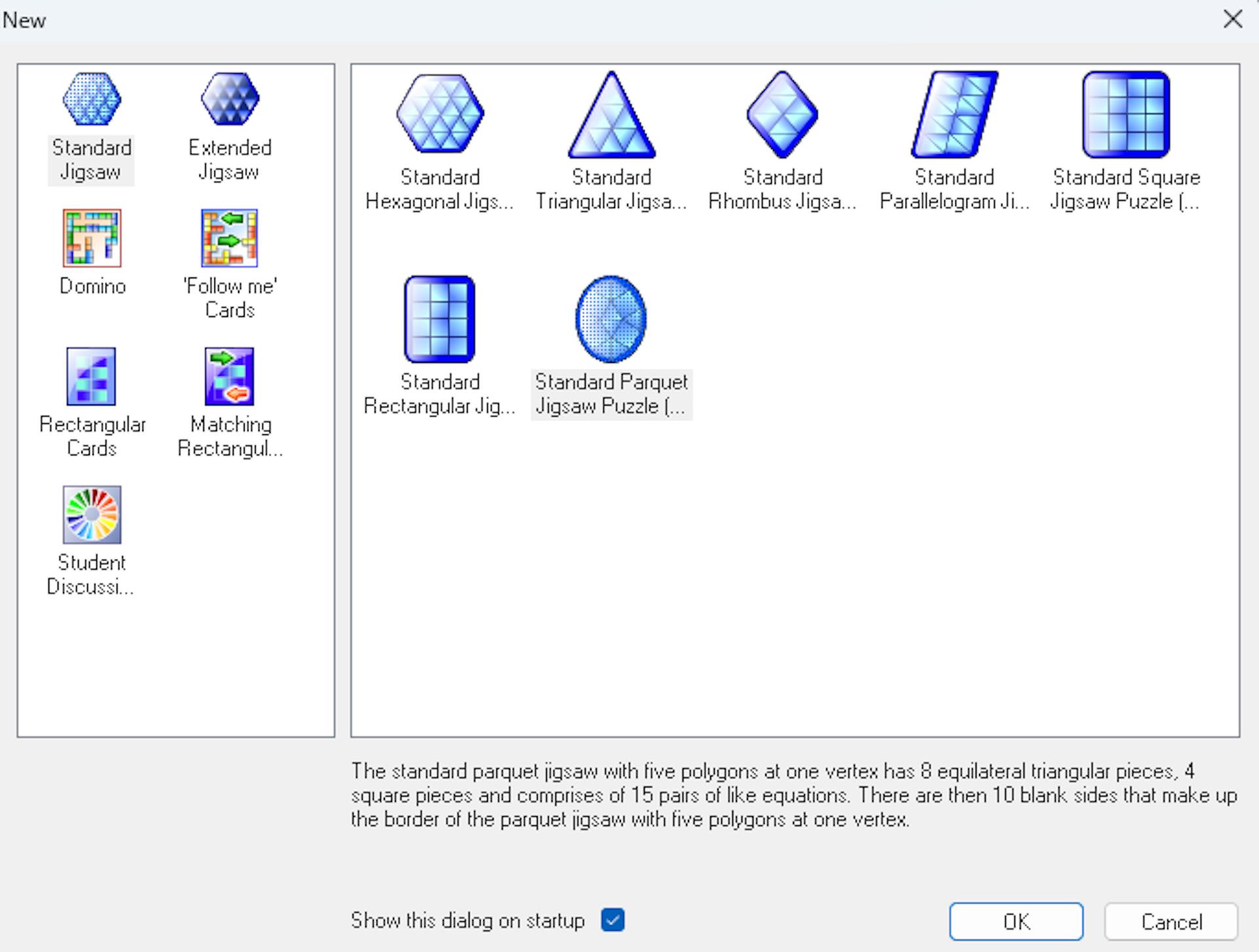 The Tarsia software presents users with a variety of puzzle types to choose from.
