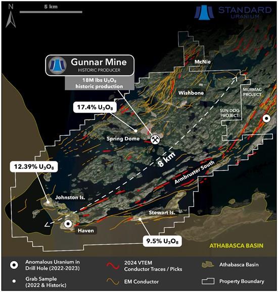 An airborne VTEMTM Plus survey was completed in 2024 to pinpoint graphitic rocks (conductors) favourable for hosting significant concentrations of uranium. This modern electromagnetic ("EM") survey improved upon historical surveys which have identified at least 40 km of combined conductor strike length.