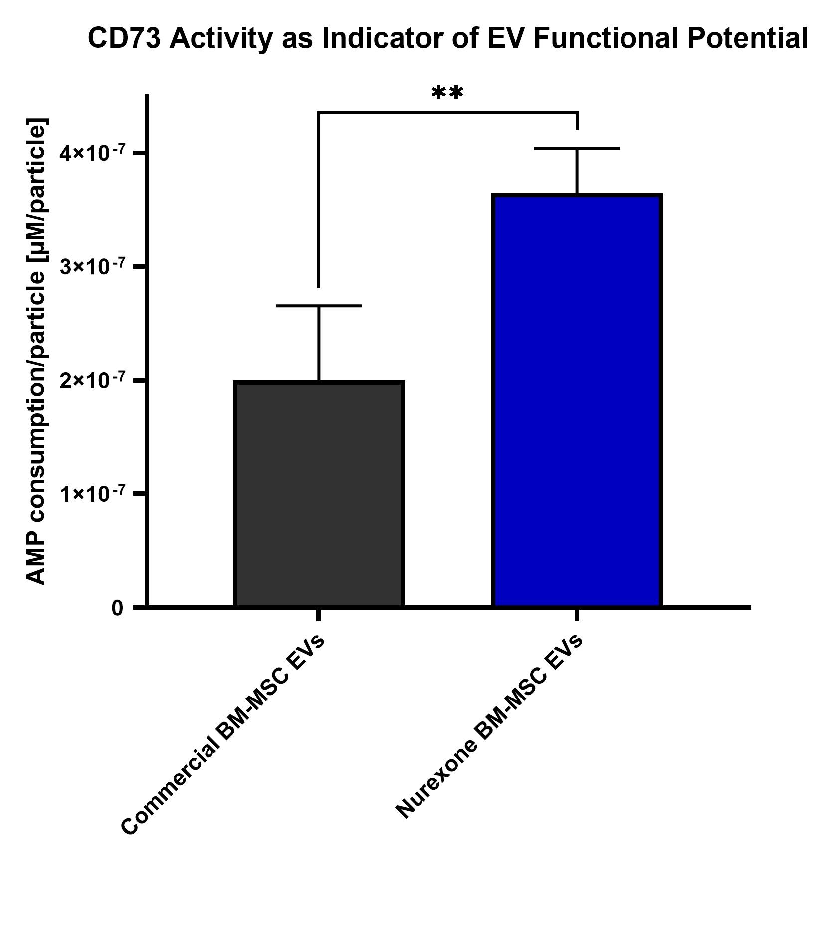 As shown in the graph below, the average of NurExone's two manufacturing batches demonstrated meaningfully higher adenosine monophosphate (“ AMP”) to adenosine conversion per particle compared with the control. The difference was statistically significant (t-test, p < 0.01), indicating that NurExone's exosomes possess stronger functional characteristics associated with regenerative potential, or in other words NurExone's exosomes can send stronger“healing” or“anti-inflammatory” signals.